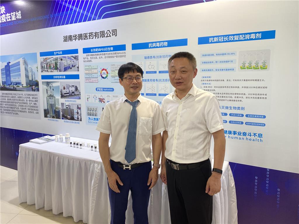 在隨后的科技成果展示環節,前來華騰醫藥展示區參觀了解的人絡繹不絕,華騰醫藥董事長鄧澤平先生更是親自接待并熱情耐心地解答他們的疑問。華騰醫藥展示區陳列了抗新冠長效復配消毒劑、瑞德西韋原料藥等公司自主研發生產的產品。作為醫藥企業,華騰醫藥利用自身抗病毒藥物技術研發優勢,在抗擊新冠疫情中發揮了重要作用。
