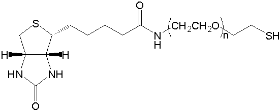 SH-PEG-Biotin中的生物素通過穩(wěn)定的酰胺接頭與線性PEG綴合,從而具有活性游離巰基,SH,半胱氨酸,巰基或巰基。SH-PEG-Biotin可通過生物素/鏈霉抗生物素蛋白結(jié)合測(cè)定可以容易地檢測(cè)生物素,因此廣泛用于分子靶標(biāo)檢測(cè)。