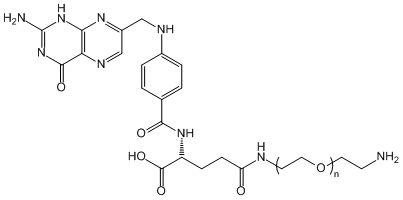 FA-PEG-NH2(葉酸PEG氨基)葉酸聚乙二醇衍生物是一類生物活性劑,可用于測(cè)定藥物或生物活性。葉酸可通過與細(xì)胞膜受體的親和受體將靶向藥物進(jìn)行傳遞。氨基易與羧基形成穩(wěn)定的酰胺鍵,也可以和活性酯(-NHS)在PH7-8.5形成酰胺鍵。